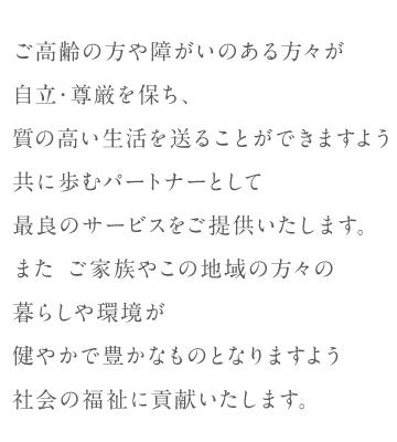 これからも高齢者や障がいのある方々が、より充実した素晴らしい生活を送ることができますよう、最良の介護サービスと、多くの交流の機会や素敵な生活の場所を提供していきたいと考えております。